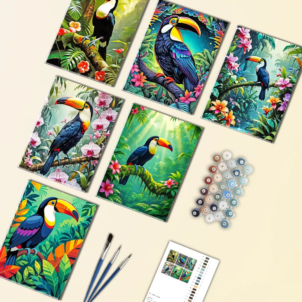 Add a vibrant touch with this mini paint-by-numbers tropical toucan design. With lush colors, playful details, and sunny tones, it brightens any small space and makes a cheerful, handmade gift.